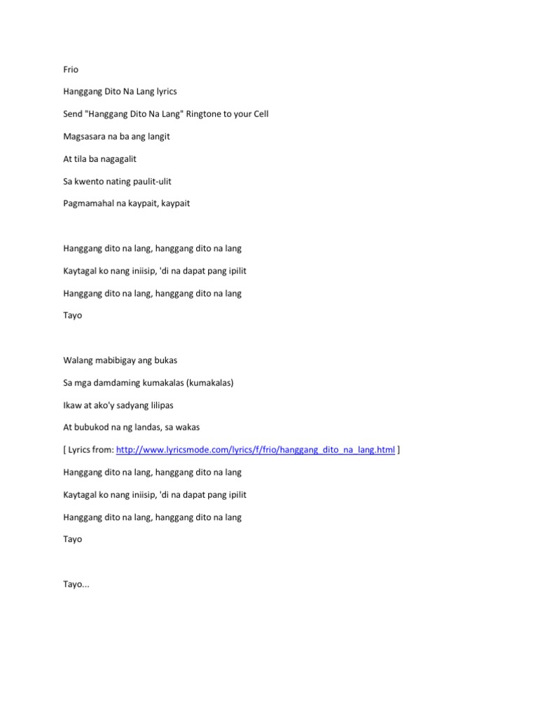 Hanggang dito na lang Akala koy habangbuhay ang awit Akala koy hanggang langit Kay haba pa ng kantahan Dito na ba tayo tatantan Kung ganito na nga ang tadhana Sarang pinto at bintana Dapat sigurong iwasan ang pagkatok sa tin ng paraan Mga nakaugalian dapat ng pagbawalan Sunugin na ang mga larawan Hanggang dito na lang Hangang dito na lang Ikaw. 04072020 Hanggang Dito Na Lang chords by TJ Monterde. Hanggang Dito Na Lang Lyrics.