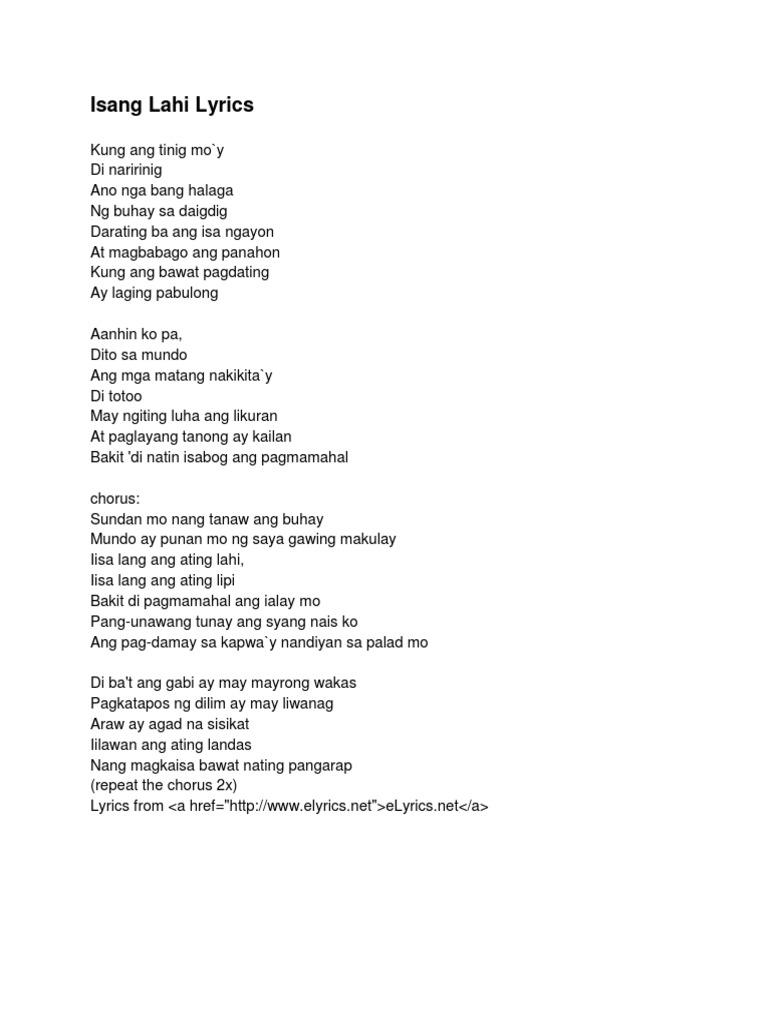 Ano Ang Mensahe Ng Kantang Isang Lahi lyrics. 21072017 Kung sa habang buhay Isa lang ang sasabihin Ang pangalan mo ang sasambitin Kung sa habang buhay Isa lang ang natatanaw Ang yong mukha ang pagmamasdan Kung iisa lang ang aking pangarap Mahalin mo ako ang nais kong matupad At kung sa habang buhay ikaw ang kapiling Wala nang kahit na ano pag nanaisin Ikaw ang panaginip ang laging nasa isip Kung sa habang buhay Isa lang ang. Browse for Ano Ang Mensahe Ng Kantang Isang Lahi song lyrics by entered search phrase.