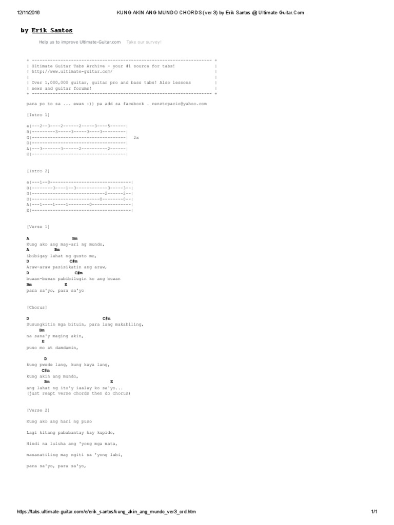 Susungkitin mga bituin para lang makahiling Na sanay maging akin Puso mo at damdamin Kung pwede lang kung kaya lang Kung akin ang mundo Ang lahat ng itoy iaalay ko sayo Kung ako ang hari ng puso Lagi kitang pababantay kay kupido Hindi na luluha ang yong mga mata Mananatiling may ngiti sa yong labi Para sayo para sayo Susungkitin mga. 892016 Kung Akin Ang Mundo chords by Erik Santos. Kung ako ang hari ng puso Lagi kitang pababantay kay kupido Hindi na luluha ang yong mga mata Mananatiling may ngiti sa yong labi Para sayo para sayo Susungkitin.