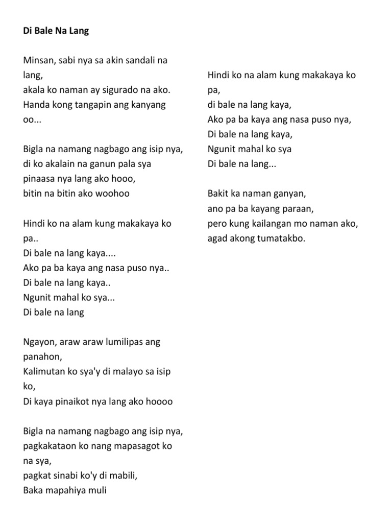 We tried to make lyrics as correct as possible however if you have any corrections for Di Bale Na Lang lyrics please feel free to submit them to us. 7212017 Handa kong tanggapin ang kanyang oo Bgla na lang nagbago ang isip niya Hindi ko akalain na ganon pala siya Pinaasa niya lang ako Bitin na bitin ako Oooh woh Hindi ko na alam kung makakaya ko pa Di bale na lang kaya Ako pa ba kaya ang nasa puso niya Di bale na lang kaya Ngunit mahal ko siya Di bale na lang Di bale na lang Di bale na lang Ngayon Araw-araw. Bakit ka naman ganyan ano pa ba kayang paraan pero kung kailangan mo naman ako agad akong tumatakbo.