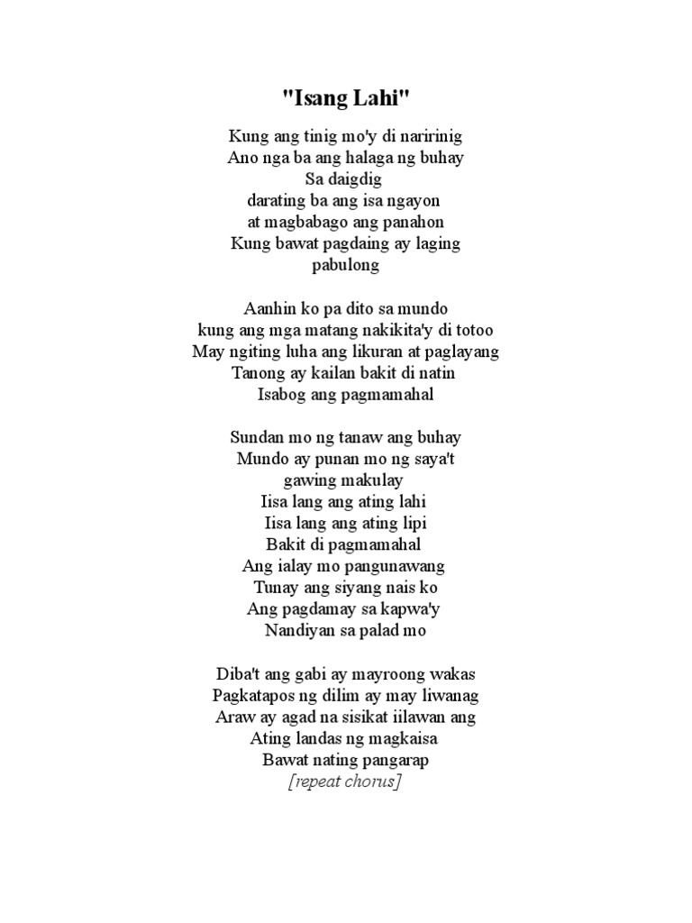Iisa lang ang ating lahi Iisa lang ang ating lipi Bakit di pagmamahal Ang ialay mo pangunawang Tunay ang siyang nais ko Ang pagdamay sa kapway Nandiyan sa palad mo Dibat ang gabi ay mayroong wakas Pagkatapos ng dilim ay may liwanag Araw ay agad na sisikat iilawan ang Ating landas ng magkaisa Bawat nating pangarap Sundan mo ng tanaw ang buhay. Iisa lang ang ating lahi Iisa lang ang ating lipi Bakit di pagmamahal Pang-unawang tunay ang syang nais ko Ang pagdamay sa kapway Nandiyan sa palad mo Dibat ang gabi ay mayroong wakas Pagkatapos ng dilim ay may liwanag Araw ay agad na sisikat Iilawan ang ating landas ng magkaisa Bawat nating pangarap Chorus Sundan mo ng tanaw ang buhay. Kung ang tinig moy di naririnig Ano nga bang halaga ng buhay sa daigdig Darating ba ang isa ngayon At magbabago ang panahon Kung bawat pagdaing ay laging pabulong.