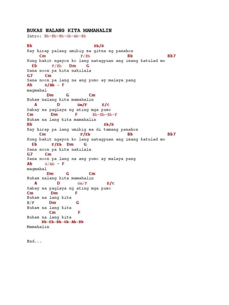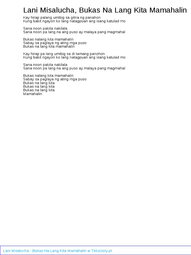 Kay hirap palang umibig sa di tamang ng panahon Kung bakit ngayon ko lang natagpuan ang is. Kay hirap palang umibig sa di tamang panahon Kung bakit ngayon ko lang natagpuan ang isang katulad mo Sana noon pakita nakilala Sana noon pa lang na ang puso ay malaya pang magmahal CHORUS Bukas nalang kita mamahalin Sabay sa paglaya ng ating. 572010 Bukas Na Lang Kita Mamahalin by Lani Misalucha chords transcribed by Rob Tomeldan date.