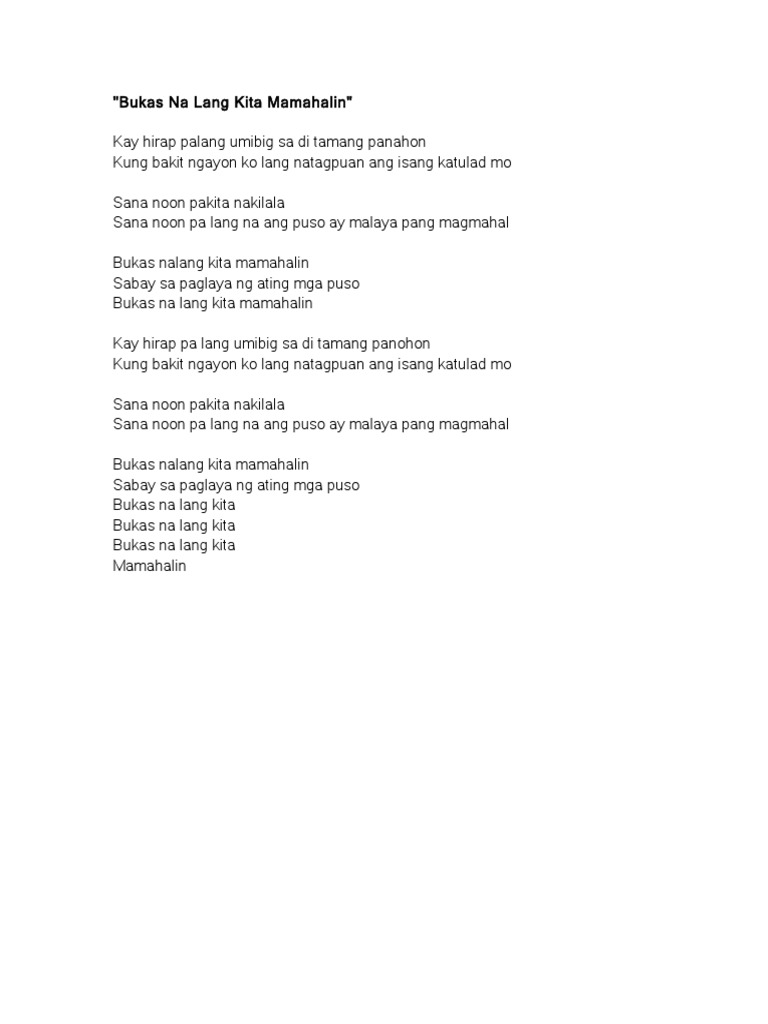Bukas nalang kita mamahalin Sabay sa paglaya ng ating mga puso Bukas na lang kita mamahalin Kay hirap pa lang umibig sa di tamang panohon Kung bakit ngayon ko lang natagpuan ang isang katulad mo Sana noon pakita nakilala. If information about Bukas Na Lang Kita Mamahalin or any song from moodpoint directory is wrong please contact us and write where the incorrect data should be replaced by correct data. Explore 23 meanings and explanations or write yours.